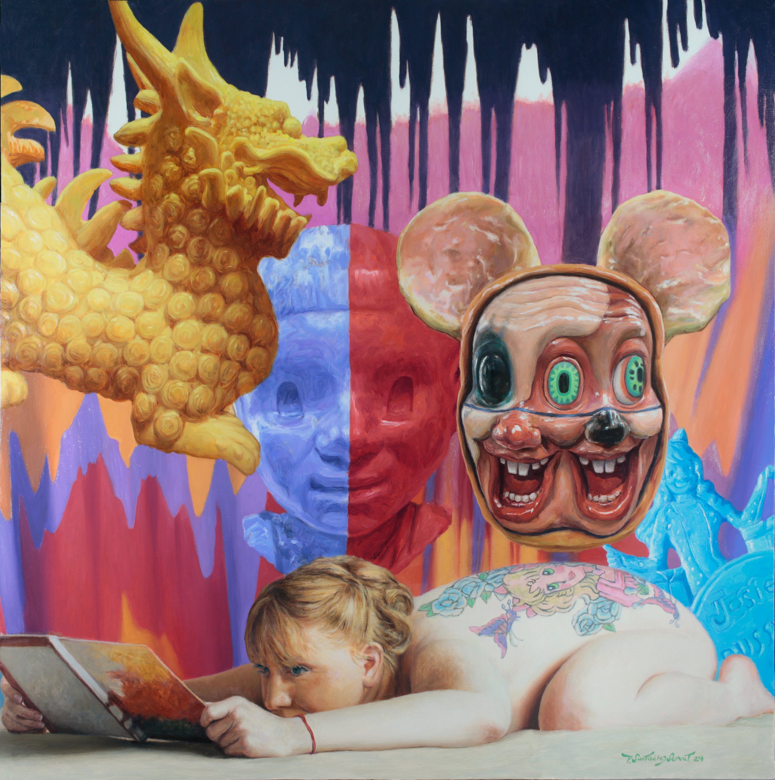 Mi inspiración surge de distintas vertientes, una de ellas es la historia del arte que veo en museos y lugares que los acumulan, tanto del mundo occidental como del mundo americano, latinoamericano. Otra vertiente surge de las artes actuales, cómo va mutando todo y las mismas ideas primigenias se renuevan y transforman en algo más contemporáneo. Finalmente la misma vida de uno, las lecturas y vivencias que he tenido amalgaman toda esta enorme fuente de imágenes e inspiración en los cuadros que pinto.